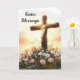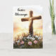 Cette carte de Pâques présente une image sereine et relevante d'une croix de bois haute au milieu d'un champ de fleurs sauvages en fleurs. La croix est éclairée par la lumière douce et dorée d'un lever de soleil, symbolisant l'espoir et le renouveau. Les fleurs, y compris les marguerites et autres fleurs colorées, apportent une touche de beauté naturelle et de joie à la scène, ce qui en fait une représentation parfaite de la saison de Pâques. A l'intérieur du côté droit : La citation inspirante est écrite à l'intérieur du côté droit, qui comprend également une photo de Jésus priant sous le texte. Citation Inspirationnelle : "Que le miracle de Pâques vous apporte foi, espoir et joie renouvelés. Je vous souhaite une belle et bénie Pâques."