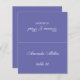 Une simple carte de mariage violet (violet) (couleur très moderne) avec le nom de l'invité et le numéro de table imprimé à l'avant et les noms de mariée et de mariée et la date du mariage imprimé à l'autre côté (c'est l'autre moitié, avant de le plier). Tout le texte est un script calligraphique blanc. Taille : 4,5 po x 5,6 po avant pliage, soit 4,5 po x 2,8 po après pliage.