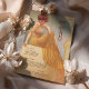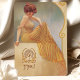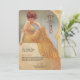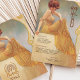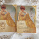 Laissez-vous tenter par le charme vintage de cette carte de menu d'inspiration Art Nouveau. Doté d'une femme gracieuse dans une robe à rayures jaunes qui coule sur un décor doux et doré orné de tourbillons complexes, ce design rayonne de sophistication et de chaleur. Le texte est magnifiquement stylisé pour compléter l'illustration, listant un menu délectable. Parfait pour les mariages, les anniversaires ou les évènements haut de gamme, cette carte est un mélange exquis d'élégance classique et de flair artistique.