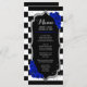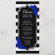 Carte de menu. Design noir noir blanc royal bleu avec fausse parties scintillant argent. Dispose de rayures noires et blanches avec des roses bleus. Parfait pour une soirée élégante.