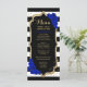 Carte de menu. Design noir noir blanc royal bleu avec faux or parties scintillant. Bandes noires et blanches avec roses bleus. Parfait pour une soirée élégante.