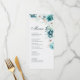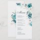 Présentez votre menu de réception avec style avec cette carte de menu de mariage botanique sarcelle. Les fleurs sauvages aquarelles et les accents botaniques doux encadrent le design, tandis que la typographie élégante garde la mise en page raffinée et facile à lire.