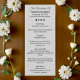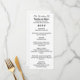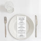 Une carte de menu de mariage avec du texte noir sur fond blanc pour les couples qui recherchent une combinaison de couleurs classique et intemporelle qui peut compléter divers thèmes de mariage. Elle convient également aux couples qui préfèrent un design basé sur le texte sans éléments de fond pour une meilleure lisibilité. Le texte noir contrastant sur le fond blanc améliore également la lisibilité. Le texte est aligné au centre et les polices utilisées sont la calligraphie, le script et le sans empattement. Les polices de calligraphie et de script sont utilisées pour améliorer le design tandis que la police sans empattement est utilisée pour améliorer la lisibilité. Personnalisez-la en saisissant les noms de la mariée et du marié, la date, le lieu et les détails du menu. Vous pouvez également modifier la formulation dans l'outil de conception, y compris le style de police, la couleur de police et la couleur de fond. Veuillez vérifier l'apparence des faces avant et arrière après avoir saisi le texte. Si l'apparence vous plaît, vous pouvez passer votre commande maintenant. Si vous devez redimensionner ou repositionner le texte, veuillez ajuster dans l'outil de conception. À la mariée et au marié, félic