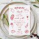 Partagez votre menu de dîner d'occasion avec ce magnifique design d'inspiration italienne avec des lettres de style manuscrit cursif accentué avec des illustrations de nourriture dessinée à la main en rouge tomate. Les illustrations comprennent les pâtes de penne, le vin, le citron sicilien, les tomates, la bruschetta, les spaghettis à la fourchette, le gâteau et le café. Customisez le titre du menu et jusqu'à trois plats.