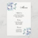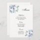 Carte Menu sur papier de base en blanc avec une belle impression florale bleue. Script et texte standard en noir. Customisez les éléments du menu en cliquant sur le bouton personnaliser, cherchez à droite et trouvez les cases appropriées pour modifier vos informations. Image stock freepik.com