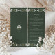 Laissez-vous tenter par l'élégance de cette carte raffinée à la carte mariage, qui présente une frontière florale d'inspiration Art nouveau. La carte est agrémentée d'un fond vert de forêt, d'une bande décorative de crème stylisée et de fleurs blanches d'albâtre qui encadrent parfaitement les plats culinaires. Les formes gracieuses et curvilignes caractéristiques du mouvement Art Nouveau apportent un air de goût raffiné et d'art historique à votre table. Le menu est classique et lisible, avec des entrées, des plats et des finitions sucrées. C'est le mélange idéal entre design fonctionnel et charme du début du siècle pour un mariage ou tout événement haut de gamme.