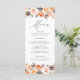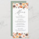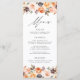 Elégante carte de menu de mariage personnalisée avec les détails de votre menu mariage au centre du menu avec des fleurs d'aquarelle, succulents, et feuilles dans les tons rose rousse, pêche, orange, crème, marron et vert. en haut et en bas. Le menu revient à un arrière - plan vert solide avec de l'espace pour le texte et les photos. Conçu pour coordonner avec notre collection de mariages de fleurs de automne rustique Watercolor.