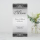 Thème : Décor noir blanc et argent, design orné. Menu de réception de mariage à double face personnalisable avec autre côté de la carte avec disposition de style élégant pour les noms de mariée et mariée, dates de mariage et monogramme / initiales. Personnalisez avec vos informations spéciales sur l'événement. Un style de design alternatif polyvalent fait de cette carte appropriée pour toute autre occasion spéciale, par exemple : dîner, 50ème anniversaire, dîners de répétition ou dîner d'anniversaire mariage.