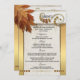 Une carte de menu chic et chic, avec des feuilles d'automne colorées sur un panneau en bois patiné blanc rustique, encadré par une doublure dorée et des tourbillons métalliques festifs. Une belle et élégante carte pour un dîner d'automne.