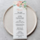 Cette carte de menu moderne rose vif à la floraison tropicale est parfaite pour un mariage de destination. Le design est joliment peint à la main, blanc, rose, des fleurs vertes aux feuilles verts, représentant grâce et élégance. Ce menu peut être utilisé pour une réception de mariage, un dîner de répétition, une douche nuptiale ou tout événement.