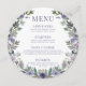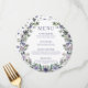 Laissez-vous séduire par le charme rustique de notre carte de menu mariage de printemps ou d'été, avec une délicieuse couronne de fleurs d'aquarelle violette et un élégant texte violet. Ce menu est un complément parfait pour vos assiettes, ajoutant une touche enchanteresse et d'inspiration saisonnière à votre fête mariage.