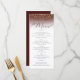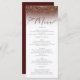 Une carte de menu de mariage élégante conçue avec un riche arrière - plan bordeaux orné de dentelle décorative damassée classique en haut, avec des détails ornés et sophistiqués avec des titres capitalisés et une typographie raffinée, créant une présentation intemporelle, formelle et artistique pour une célébration mariage.