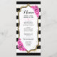 Carte de menu. Design noir et blanc élégant avec faux strass doré. Le design floral présente des rayures noires et blanches, une police script et des roses roses. Parfait pour une fête élégante.