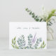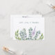 Cartes de message Merci avec des tiges d'eucalyptus et de lavande. "Amour et merci" sur le devant en bleu, avec un exemple de message sur le dos des cartes à plat. Le texte imprimé à la main est bleu et les deux côtés sont décorés de tiges feuillues dans les tons bleu et vert, avec un motif lavande. Les jeunes mariés peuvent changer le message et envoyer à remercier les invités pour les cadeaux, aux membres de la fête de mariage, et tous les autres qui ont contribué à rendre la journée de mariage spéciale. La carte 4x6 de taille plus petite est affichée sur une mise à niveau de papier feutre. Modifiez la taille et le papier selon vos besoins, ou choisissez l'option de téléchargement.