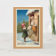 Conçu par Susan Epps Oliver. Image vintage d'une petite fille portant un manteau vert et un casquette rose qui envoie sa liste de Noël au Père Noël. Père Noël la regarde de l'intérieur du bureau de poste.