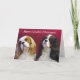 C'est une carte de Noël comportant une photographie originale de deux épagneuls cavaliers du Roi Charles, un tricolore et d'un blenheim, tous les deux avec leurs têtes entassées avec une expression mignonne et railleuse, sur un fond rouge foncé avec le texte, "Joyeux Noël cavalier !".