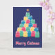 Une carte de Noël colorée représentant des chats en forme d'arbre de Noël. Fond bleu. Le texte au bas de la carte dit "Joyeux Catmas". Intérieur vierge pour votre propre message. Taille 5 "x 7".