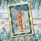 La façade de cette carte de voeux de Noël a une belle image d'une publicité dans le magazine français de l'ère victorienne La Vie Parisienne. Une femme en tenue de ski tient un poteau de ski à la main contre un bel arrière - plan de montagne. Derrière elle, un skieur est tiré par un cheval et un cavalier. Tout est encadré d'une doublure turquoise et dorée et placé sur un arrière - plan doré.C'est une belle image, et c'est amusant de fêter les fêtes de la façon désuète! L'intérieur gauche de cette carte est bleu correspondant, tandis que le côté droit contient votre message et votre signature faciles à customiser.