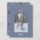 Un renne mod est assis sur une photo de famille voûtée sur cette carte de vacances bleu ardoise et rose saumon.
