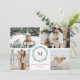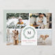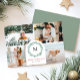 Carte photo de Noël moderne et minimale avec 4 photos avec un accent de couronne d'aquarelle moderne, qui encadre votre monogramme familial ou initial. Le texte dit Joyeux Noël en rouge, qui peut être customisé à tout salut que vous voulez. Le dos de la carte comporte un deuxième accueil personnel avec vos noms.