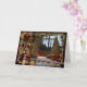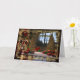 Cette carte de Noël élégante présente un salon chaleureux et festif, joliment décoré pour les vacances. La scène est ornée de deux arbres de Noël étincelants, ornés d'ornements rouges et dorés, entourés de cadeaux soigneusement emballés en rouge, vert et or. Une cheminée chaleureuse avec des bas accrochés au manteau et des guirlandes luxuriantes drapées de bougies ajoutent au charme classique des vacances. La bordure dorée améliore le caractère riche et traditionnel de la carte, tandis que le salut "Joyeux Noël" est écrit dans un script doré raffiné en haut. Parfait pour envoyer des voeux de vacances sophistiqués à des amis et à la famille.