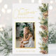 Cette carte de Noël en feuille d'or dorée présente une verdure peinte à la main et des pommes de pin disposées comme un beau cadre latéral. Le texte est marron et le fond est blanc. Le dos comprend le même cadre avec du texte pour personnaliser (ou laissez vide pour supprimer le texte). Trouvez des articles assortis dans la collection de Noël Pinecone et Greenery Christmas Holiday.