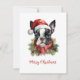 Joli petit Boston Terrier dans un chapeau de Santa et écharpe rouge entouré de verdure hivernale et de baies rouges. Personnalisez avec votre propre message.