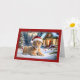 Sur le devant de cette carte de Noël, on peut voir une image charmante d'un jeune lionceau allongé dans la neige, portant un chapeau festif de Père Noël. Le petit regarde vers l'avant avec une expression curieuse et innocente, entourée de décorations de vacances. Dans l'arrière - plan, un cabine douillet est orné de lampes et de couronnes de Noël, encadrées d'arbres enneigés, donnant à la scène une ambiance pittoresque de pays des merveilles hivernales. Le texte "Joyeux Noël" est affiché en haut dans une police élégante et classique, ajoutant à l'esprit festif. La bordure de la carte est d'un rouge profond, rehaussant l'atmosphère de vacances et faisant ressortir l'image encore plus. Cette carte serait parfaite pour les amoureux des animaux et ceux qui aiment une approche amusante et chaleureuse des cartes de fin de année traditionnels. Il transmet un message de chaleur, de joie et d'émerveillement de Noël dans la nature.