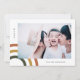 Carte de vacances verte minime et joyeuse avec des tons de terre boho arc-en-ciel et simple texte Merry avec nom et photo.