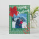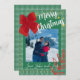 Thème de Noël, fond vert à carreaux, nœud rouge et feuille rouge, et éléments dorés encadrent la carte et la photo du couple. Modèle de nom modifiable.