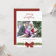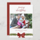 Célébrez la saison avec cette charmante carte de Noël Rustic Red Bow. Doté d'une calligraphie élégante, d'un motif en pin et en arc aquarelle et d'un espace pour votre photo de famille préférée, cette carte allie chaleur et style. Le dos comprend un message et des noms personnalisables, ce qui le rend parfait pour partager des voeux de vacances sincères avec des proches.