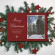 Carte de vœux rustique de Noël avec une scène de nature, représentant un paysage forestier hivernal après une récente chute de neige. Placée sur un fond rouge, vous pouvez personnaliser avec des lettres blanches en écriture cursive. Vous pouvez également ajouter votre propre photo si vous le souhaitez. Une belle carte pour envoyer vos vœux de fêtes à vos amis et à votre famille.
