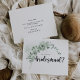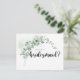 Cette carte de proposition classique d'eucalyptus bridesmaid est parfaite pour un mariage rustique. Le design présente de beaux feuilles d'eucalyptus vert aquarelle. Changez le libellé et utilisez ces cartes pour demander à tous les membres de votre fête de mariage : bonne d'honneur, maîtresse d'honneur, demoiselle d'honneur, demoiselle d'honneur, demoiselle d'honneur junior, fille de fleurs, meilleur homme, groomsmen et plus !