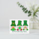 Carte de note d'invitation de la fête de St Patrick Gnomies. Trois gnomes vêtus de leurs meilleurs tenues de la Saint Patrick sur le devant de la carte. Informations sur la fête à l'arrière. La taille de la carte de note est pour ceux qui ont un budget.