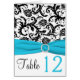 Carte de numéro de table Damask bleu, blanc et noi