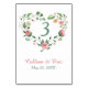 Une jolie feuille verte, un rose corallien et une couronne de bourgeon en forme de coeur forment un cadre pour votre numéro de table. En bas se trouve votre texte personnalisé dans deux champs, un rose rose et un vert doux. Les deux côtés ont la même image et le même texte. *Crédit de design floral à CreativeQubeDesign.
