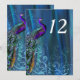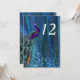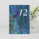 Élégante carte de numéro de table de réception de mariage, avec des graphiques sur fond de satin couleur turquoise riche, avec un flourish bleu et un paon coloré. Personnalisez le numéro blanc et la taille que vous souhaitez pour la carte, pour chaque table à votre réception. Produits assortis disponibles.