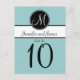 Elégant Mariage simple bleu noir noir Monogramme Cartes Numéro de table. Elke Clarke © Ces cartes postales de numéro de table de mariage sont affichées avec un arrière - plan bleu clair, un monogramme blanc initial sur une étiquette de cercle noir et les noms de mariée et de mariée sur une bande noire et blanche. Customisez avec les noms de mariée et de mariée, monogramme initial, numéro de table et couleurs de mariage en utilisant les invites de menu faciles à utiliser de Zazzle. Ce monogramme simple mais élégant design initial fonctionne pour toutes les lettres de l'alphabet et est entièrement personnalisable pour convenir à n'importe quelle combinaison de couleurs. Commandez une carte pour chaque numéro de table différent. Vous le changez à chaque numéro, puis vous l'ajoutez à votre panier.