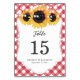 Carte de numéro de table de en vichy rouge rustique avec des tournesols et des lampes à cordes contre un arrière - plan à damiers rouge. Éléments correspondants disponibles.