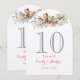 Carte de numéro de table de mariage vintage oiseaux de l'amour rose et vert. Numéro de table gris, lettrage de script d'information rose et volutes de bronze sur une branche d'arbre charmante couverte de douces fleurs printanières avec deux oiseaux de l'amour romantiques assis l'un à côté de l'autre de manière douce. Mariages d'oiseaux vintage et occasions spéciales . Panneaux de table de mariage