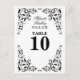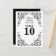 © 2011 Socialite Designs. Une élégante carte de numéro de table en noir et blanc avec de magnifiques tourbillons décoratifs en angle prêts à être personnalisés pour votre événement. Le style de police peut être modifié. Vous avez besoin d'aide pour personnaliser ? N'hésitez pas à me contacter avec vos exigences et un lien vers ce design.