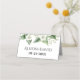 Cette élégante carte de place à mariage floral présente une branche d'eucalyptus avec des fleurs blanches et des feuilles verts sauge et de la verdure au sommet. Les noms sont écrits dans la typographie décorative.