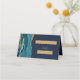 Cette élégante table mariage moderne réservée carte de place dispose d'une bordure en aquarelle bleue turquoise ornée d'une fausse parties scintillant dorée. L'avant de la carte donne des espaces pour le nom et le numéro de table du client. Le mot "table" apparaît en écriture manuscrite de couleur or avec des swashes avant et après sur un arrière - plan bleu marine. Customisez le dos de la carte avec les noms de la mariée et du marié en écriture manuscrite couleur or et la date du mariage ci-dessous.