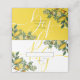 Ce design présente un arrangement élégant mais simple des initiales personnalisées de la mariée et du marié encadrées par des illustrations vintages d'agrumes et de citrons. Le texte est placé au-dessus des initiales du prénom de la mariée et du marié qui sont affichées dans la typographie jaune. Ce design jaune, blanc et vert est simple mais élégant dans tous les sens. Le verso affiche un arrière - plan jaune citron avec les initiales en blanc et les accents d'agrumes au-dessus et au-dessous. Le mélange des couleurs crée un style chic, tendance et sophistiqué. Design élégant de carte de lieu de mariage avec des éléments modernes. Des invitations de mariage et des articles de papeterie sont également disponibles.