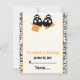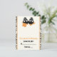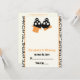 Carte de placement de mariage Halloween crânes élégants orange, représentant un couple de crânes noirs mariés sur fond ivoire avec une bordure à motif de crânes. Le marié porte un chapeau orange et la mariée un nœud orange. Pliez la carte le long du centre.