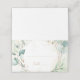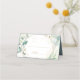 Carte de place pliée mariage moderne avec feuilles eucalyptus et verdure entourant un cadre géométrique en faux or, sur un lave pastel aquarelle. L'intérieur est assorti d'une teinte de bleu clair. Cet élégant design rustique est idéal pour un mariage à thème botanique en été.