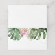 Carte de lieu à thème tropical moderne avec illustration aquarelle de feuilles de monstera, de feuilles de palmier et de fleurs de protea roi rose. Parfait pour votre mariage d'été, douche de mariée, douche de bébé ou fêtes d'anniversaire.