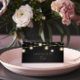 Design moderne avec des cordes de lumières brillantes sur arrière - plan de tableau noir. Décor de fête Étiquette alimentaire Tente Cartes de place Carte de numéro de table Forme de la tente. Ces cartes sont recto-verso et arrivent à plat. Vous devrez les marquer et les plier. Partie d'une collection. Éléments correspondants disponibles.