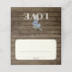 Jarre rustique avec fleurs bleues sur arrière - plan en bois de grange, carte de séjour pliée avec espace blanc pour écrire à la main les noms et le numéro de table et les noms personnalisés et le message à l'envers.