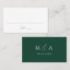 Cartes mariages modernes avec un script de calligraphie vert foncé sur un arrière - plan blanc. Le verso des cartes de place vertes contient vos initiales monographiques avec la date de votre mariage indiquée ci-dessous. Les élégantes cartes de place de script sont parfaites pour des réceptions de mariage modernes, des dîners de répétition et d'autres événements spéciaux.